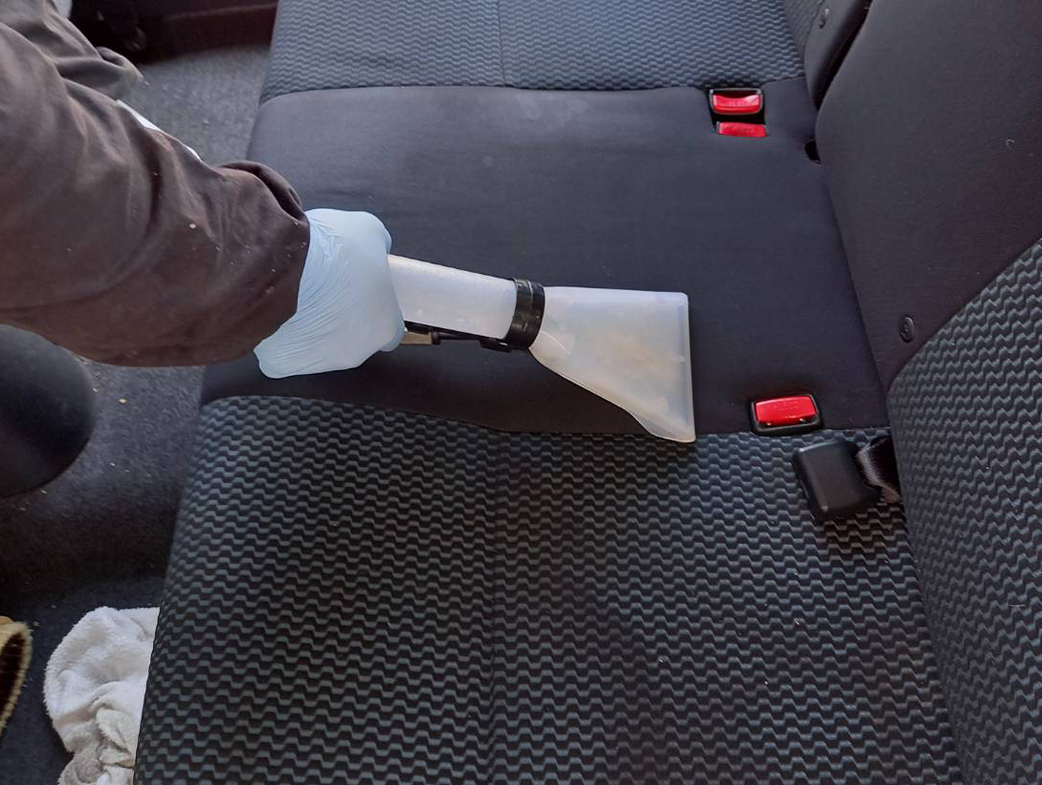 シート、天井などの布製品をクリーニングする際に使用する「立体面洗浄機リンサー」 加圧した水を噴射し、同時にバキュームにて吸い上げる機械で、洗濯で言う「すすぎ」が行えます。これにより汚れはもちろん洗剤の回収も行えるので、洗剤成分の残留汚染も防げ、根本的なリフレッシュを行います。